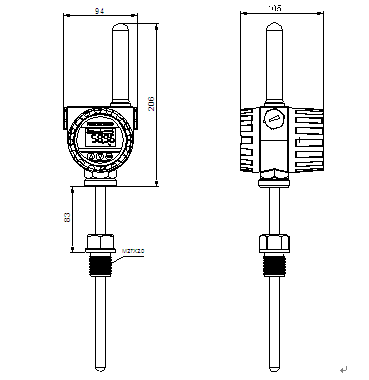 无线温度变送器一般采用M27×2.0的连接安装方式,也可根据用户的要求设计制造不同的安装接口和插入深度。由于该类设备的表面温度一般也较高,所以 为了保护仪表正常工作、及电池的使用寿命,我们特意为仪表设计了隔热层。