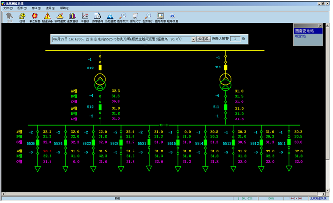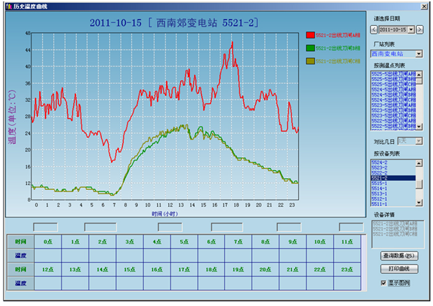 数据可以按一次接线图、曲线、报表等方式直观显示,监测系统采用厂站一次接线图显示的方式显示实时的温度。当某一部位温度越限或温度升高过快时,会在相应的位置醒目标注,并会同步弹出告警画面、进行声光、语音报警。温度曲线很丰富,包括实时曲线,多日曲线对比、同一设备不同测点间温度对比、年曲线、月曲线等多种灵活方式。