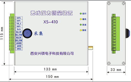 压力采集部分采用电池供电,内部采用微功耗高速微处理器、高速信号信号转换器及先进的短距离无线通讯技术,使得它能够胜任这些特定的使用工矿;无线通讯中心频率为433MHz,在国家公布的开放频段。